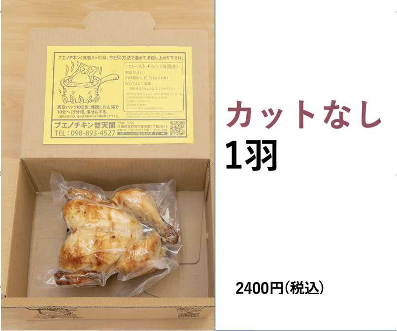 ブエノチキン 丸焼き カットなし (1羽) ツイートする シェアする 販売価格: 2,400円(税込み) 会員価格 (税込み) 通常価格 (税込み) 在庫 商品コード JANコード 数量 - + ただいまご注文いただけません。